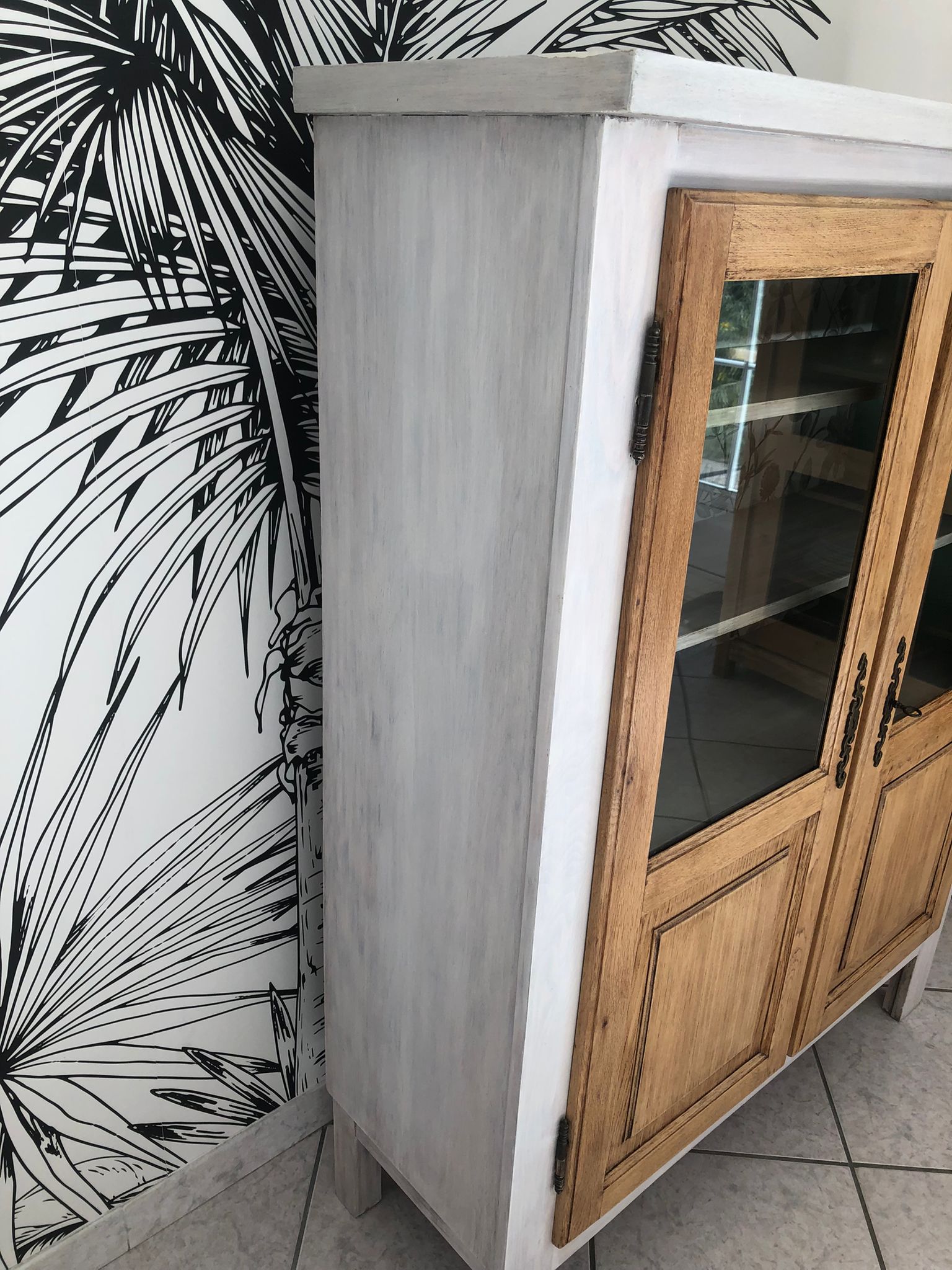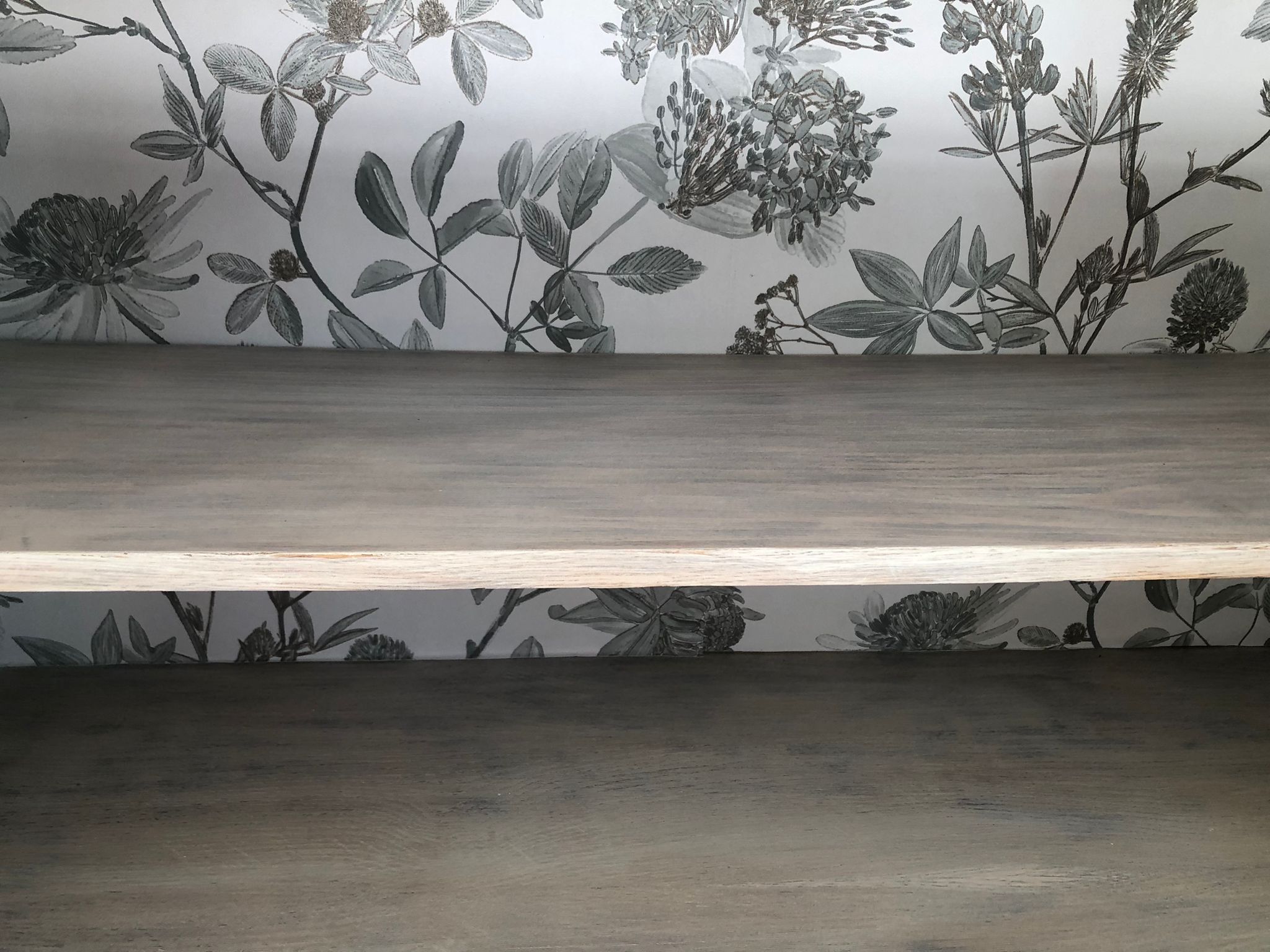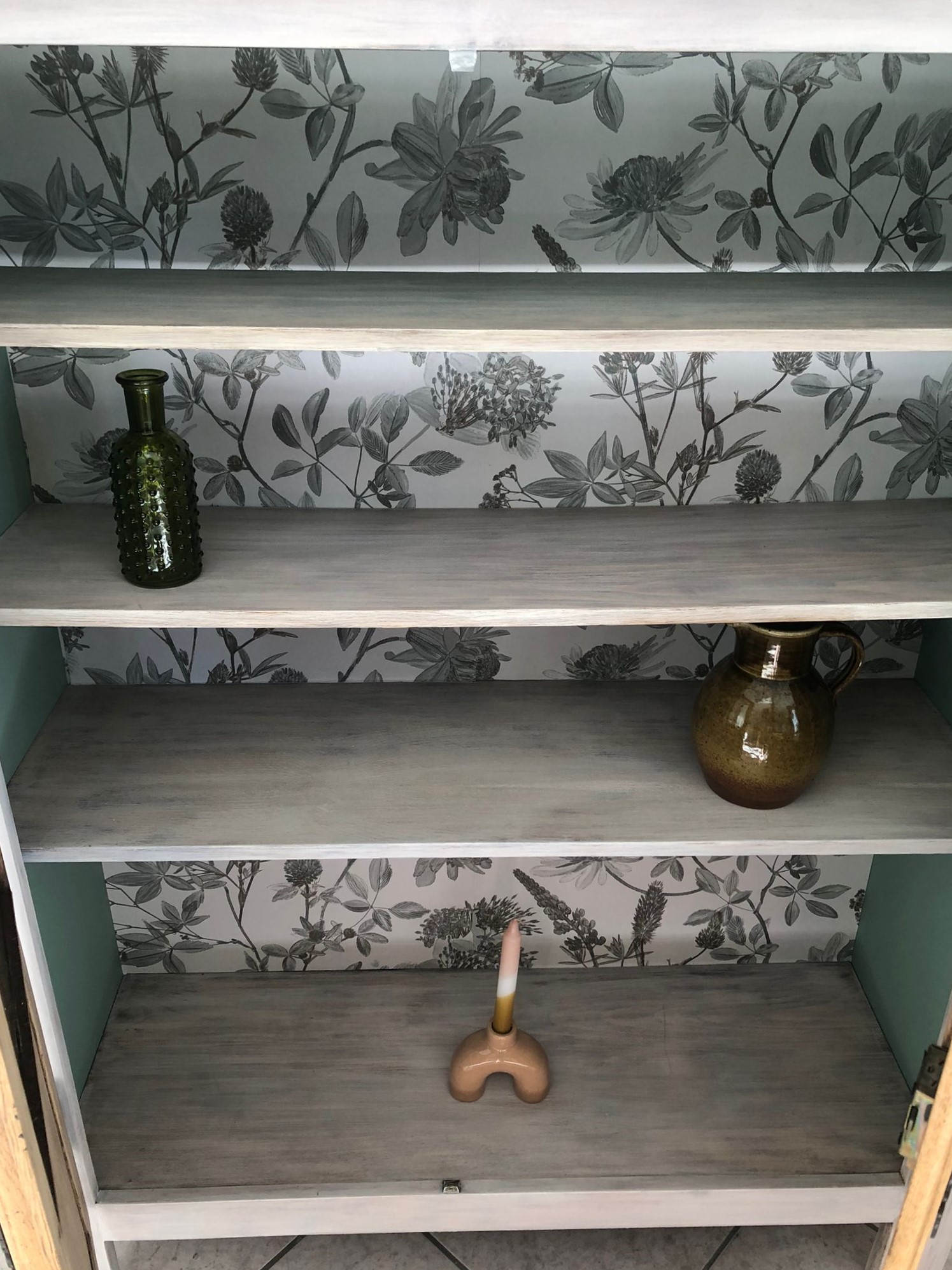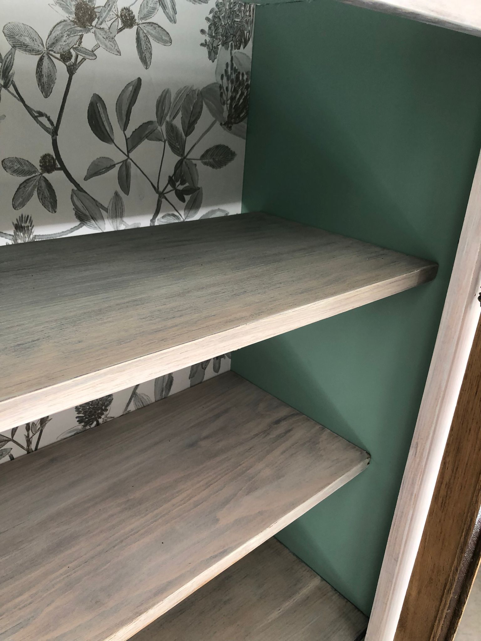 Buffet en bois. Bois brut et céruse blanche autour et sur les étagères. Papier peint sur le font et peinture verte sur les côtés.