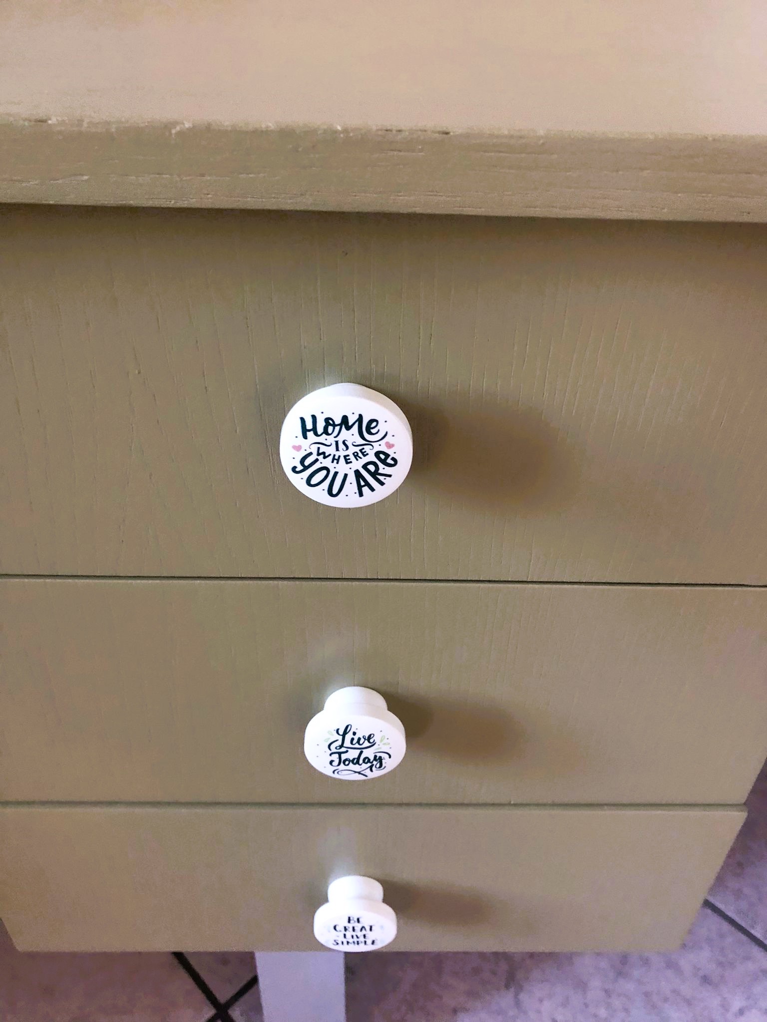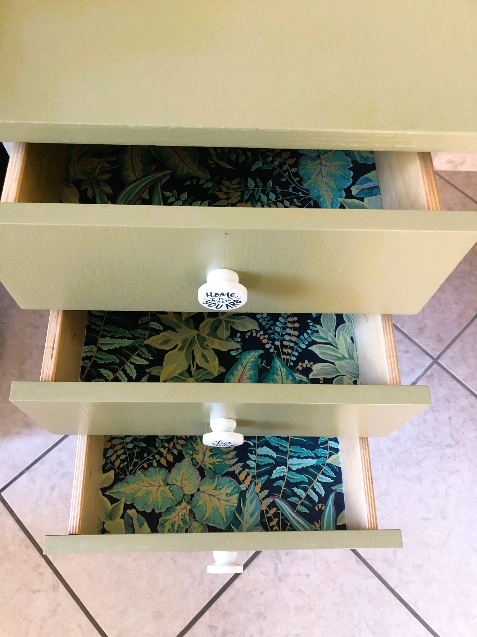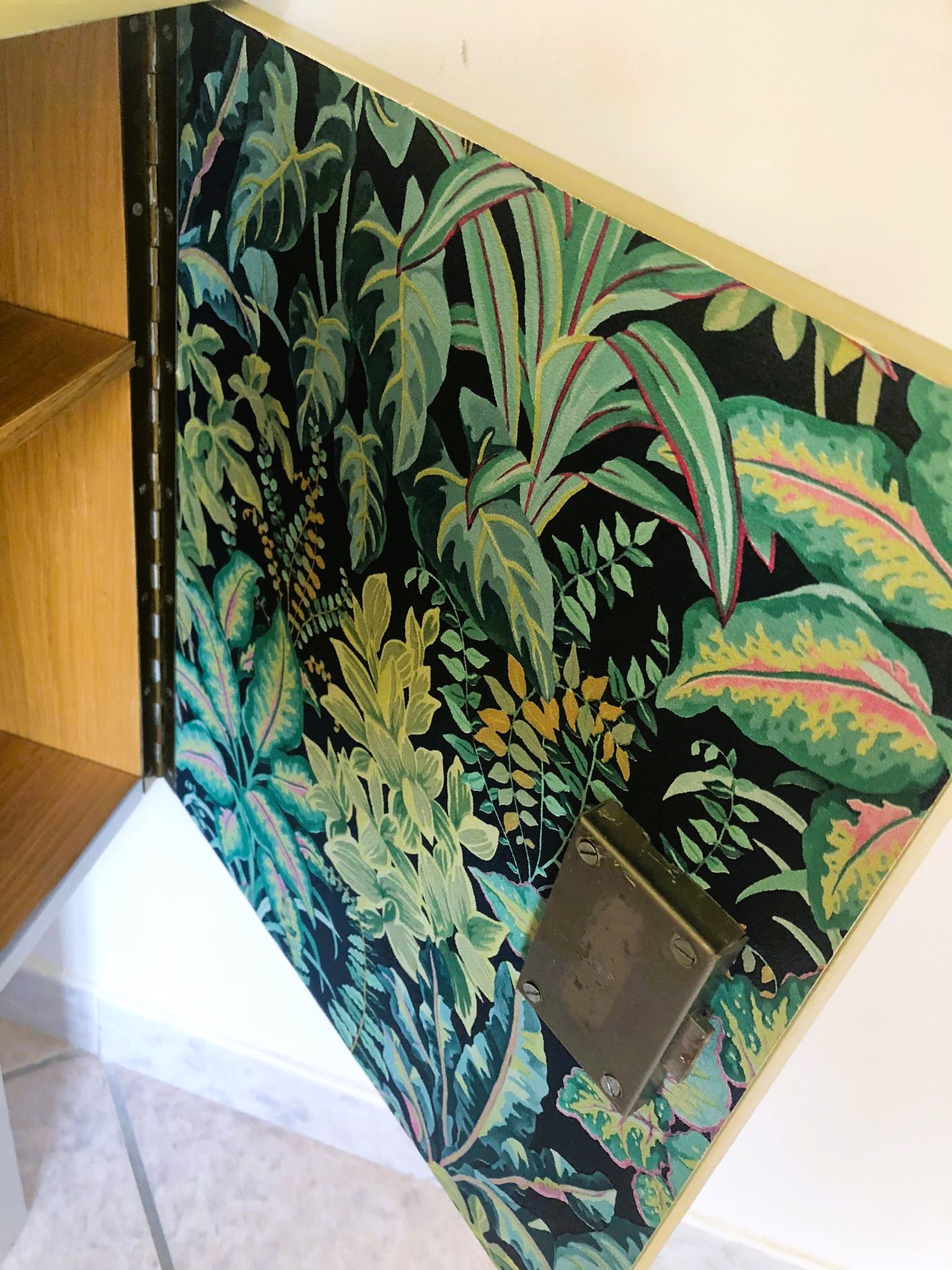 Bureau vintage vert kaki et gris souris. Papier peint à l’intérieur de la porte et des tiroirs.