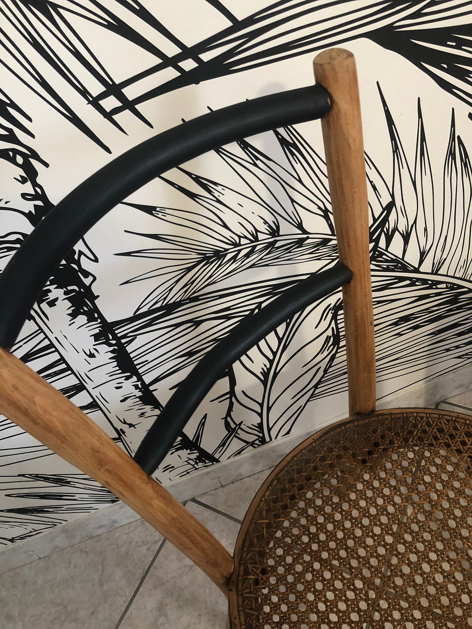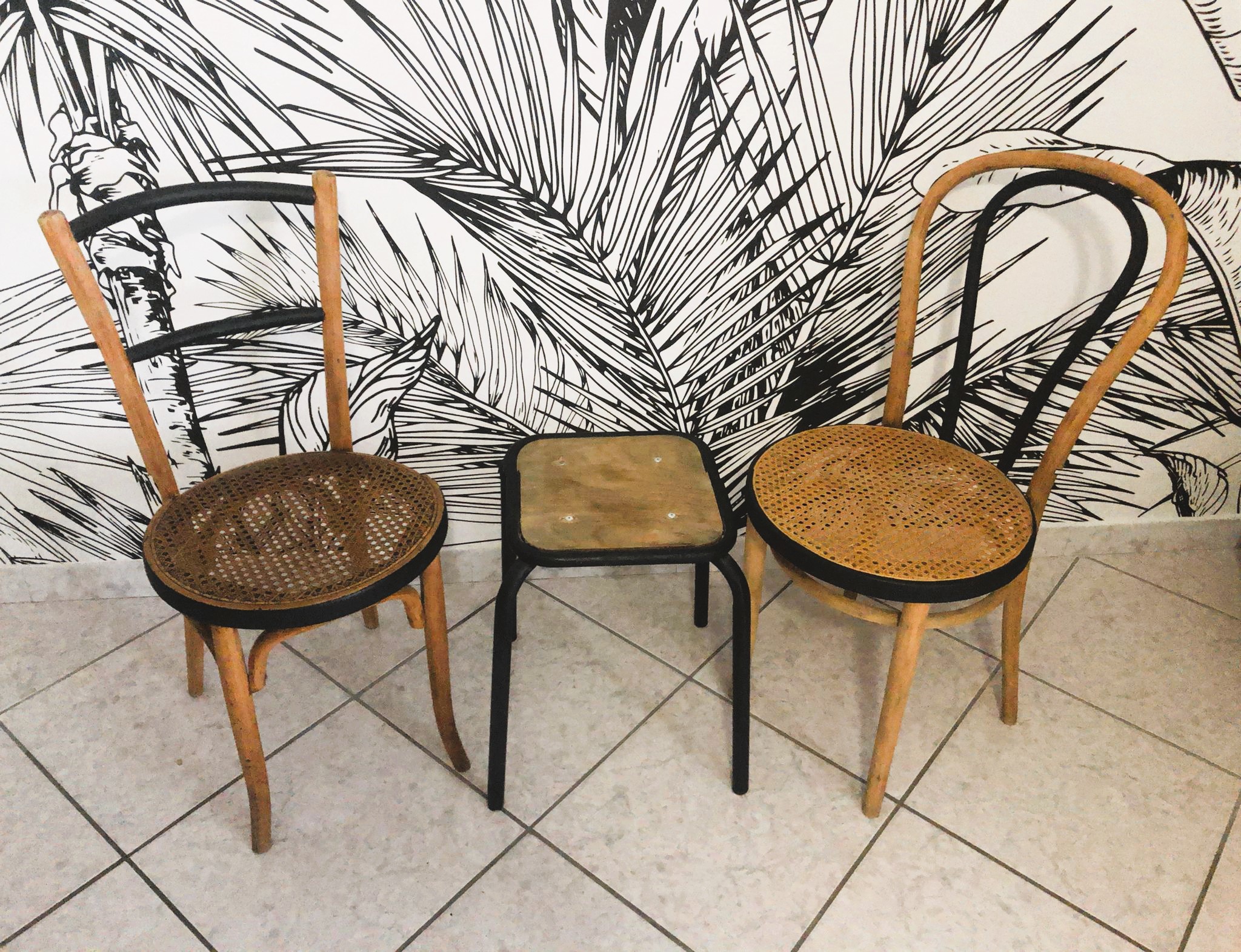Les chaises ont été poncées et peintes en noir à certains endroits. Le tabouret à été poncé également, le métal peint en noir et l’assis vernis.